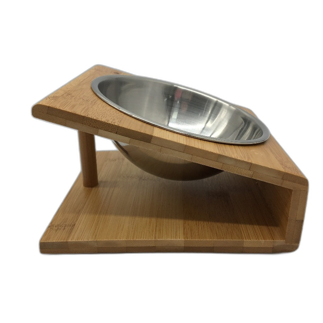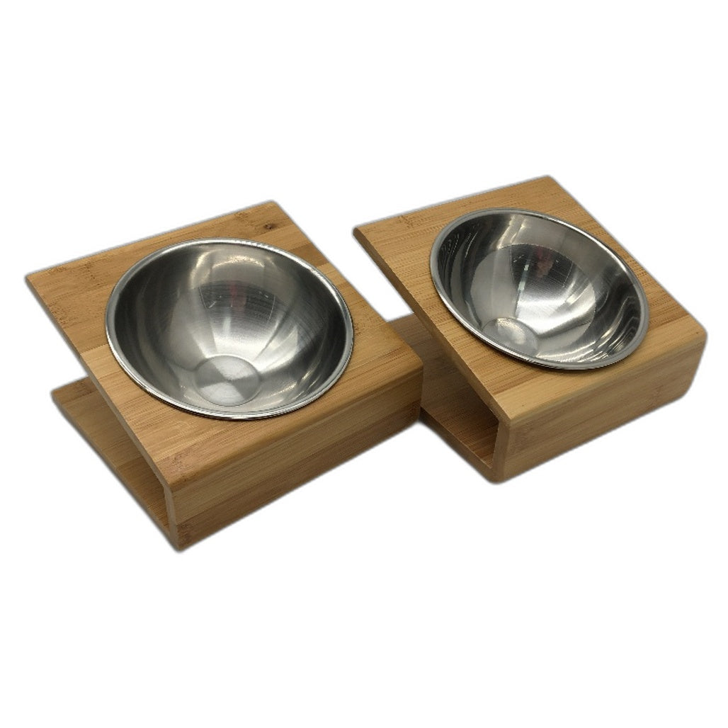 - 2 Pack Bamboo Elevated Slanted Pet Feeder Stand St Steel Bowl Cats & Dogs NEW