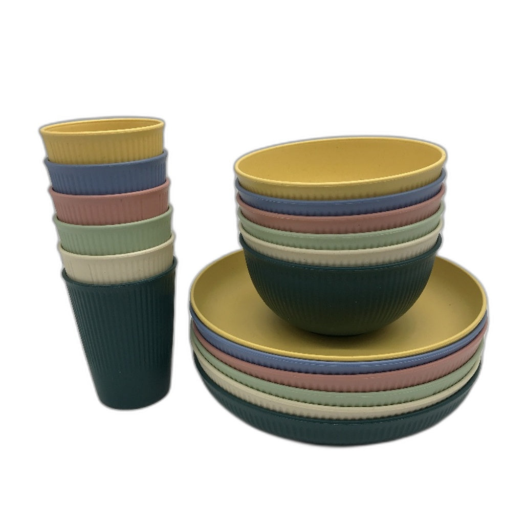 - 18 Piece Wheat Straw Multicoloured Dinnerware Bowl Plates and Cup Set NEW