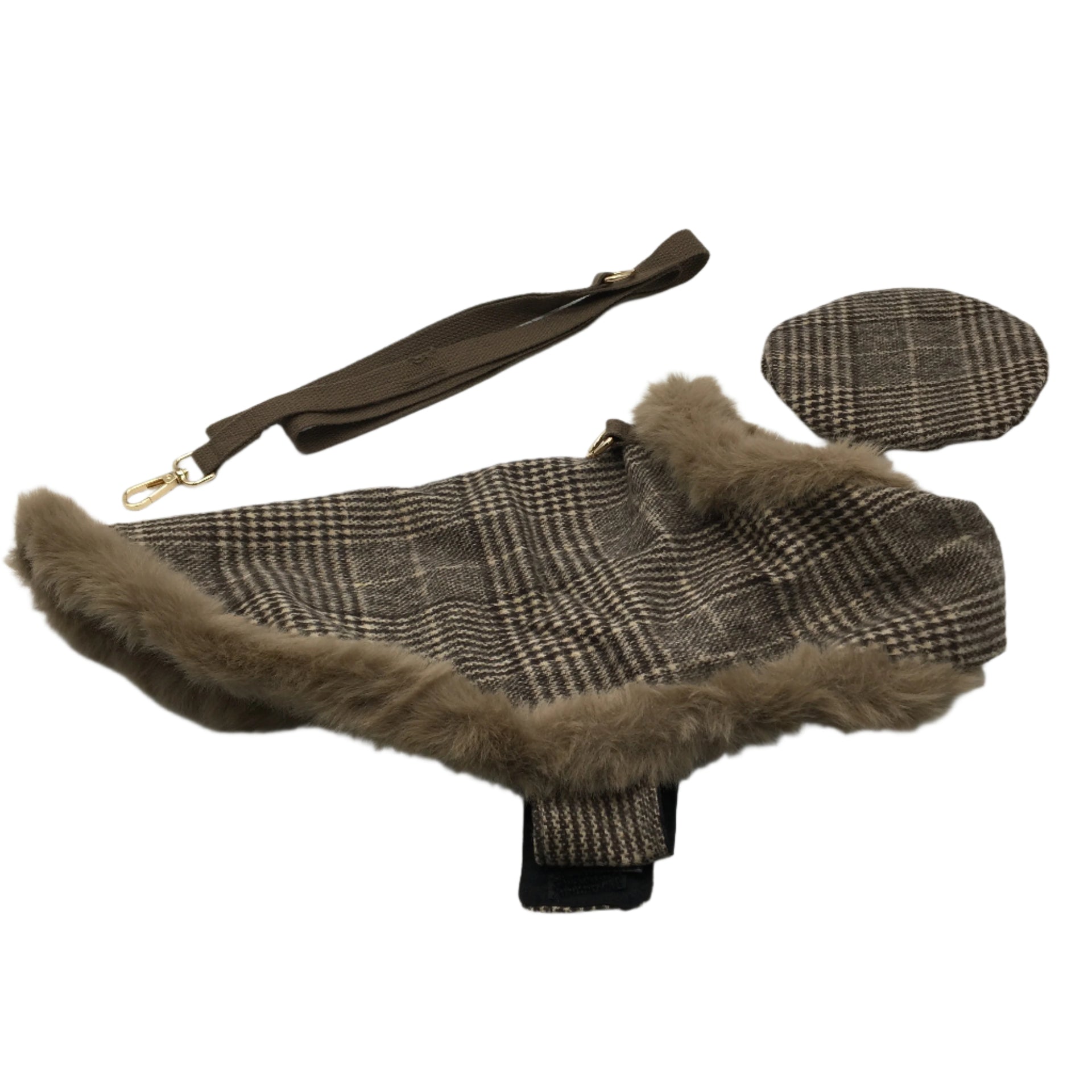 - Milo & Mink Brown Plaid Faux Fur Trim Dog Coat Harness With Hat & Leash Size XXS