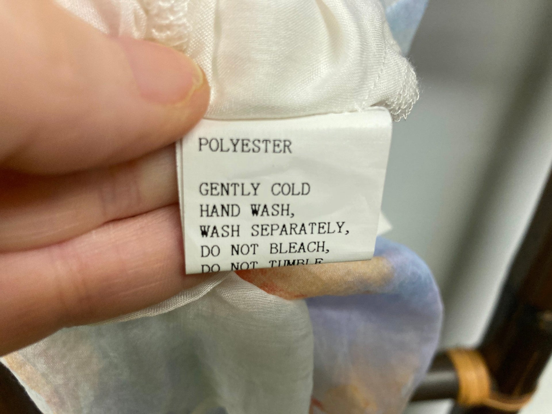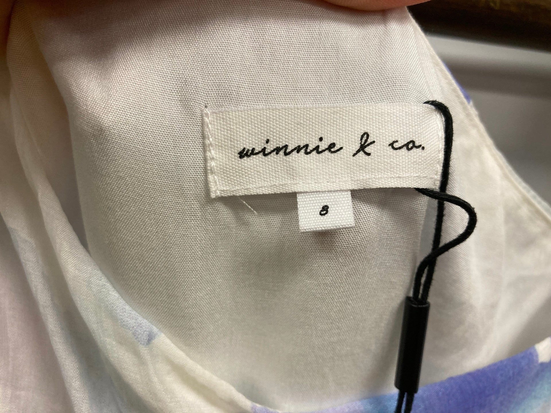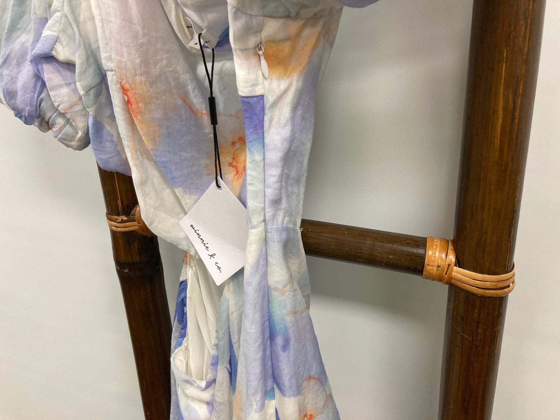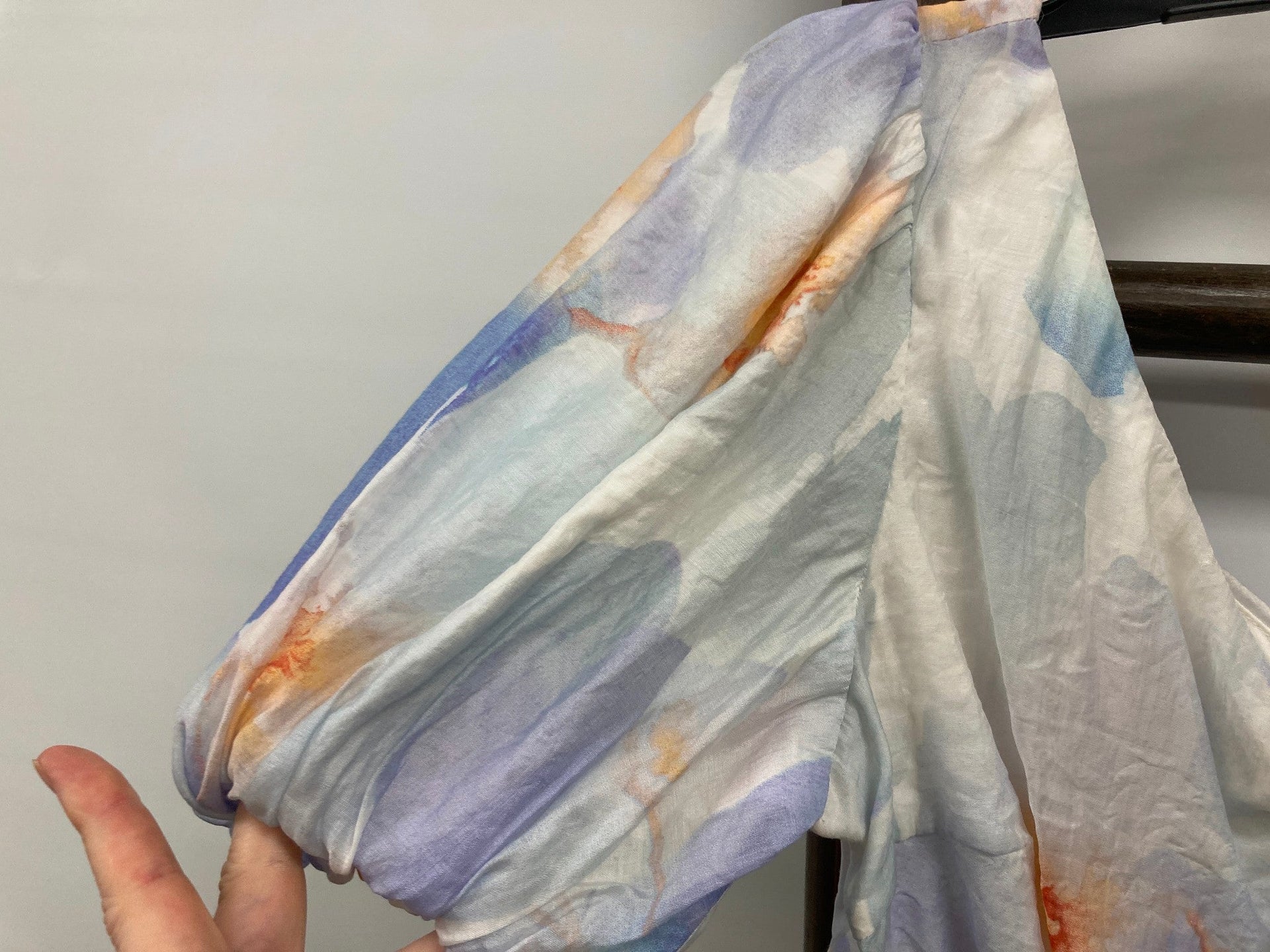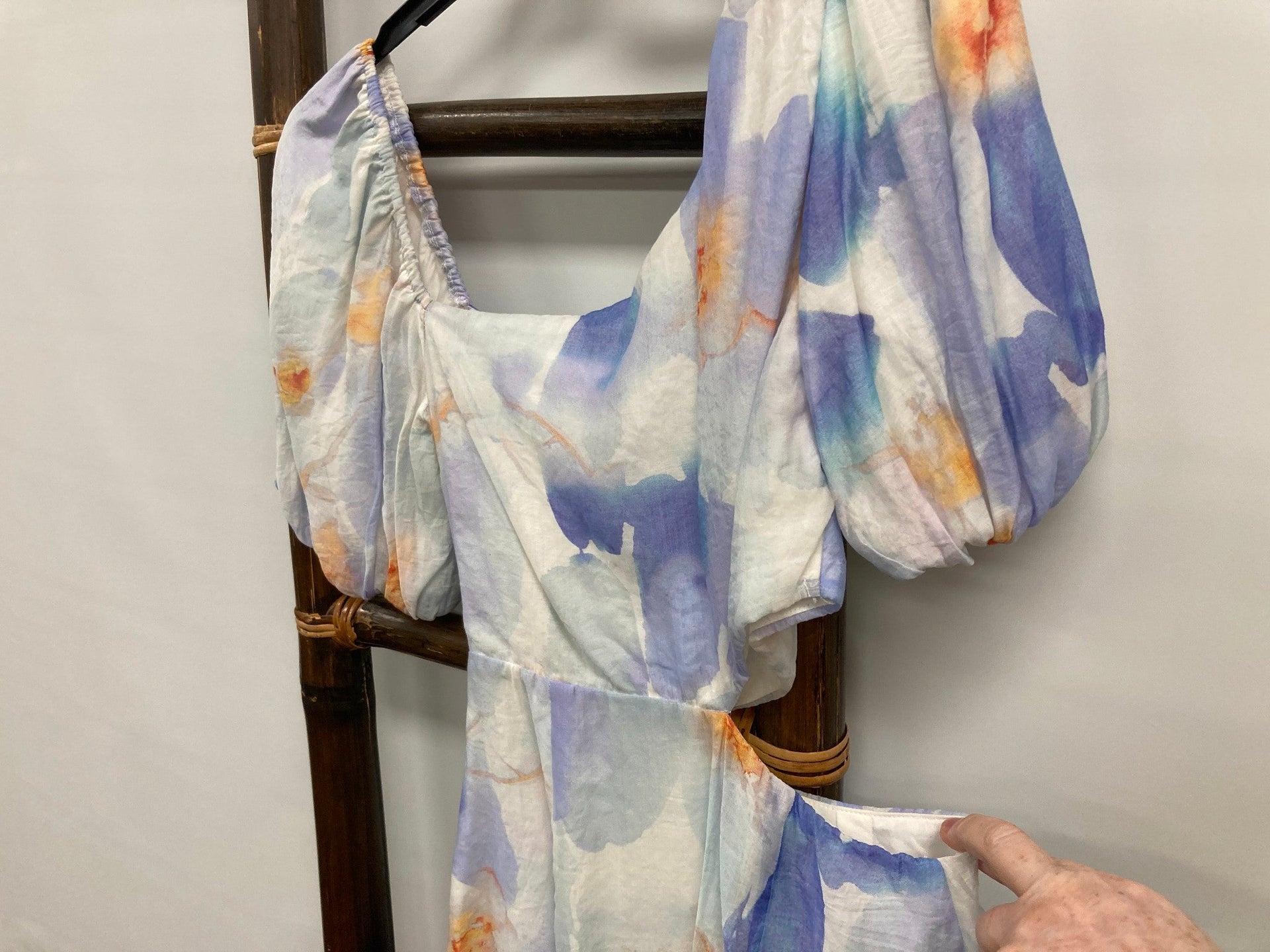 Brand New with tags, a light flowy lined dress with puffy sleeves and a cut out section on the right side (see photos)