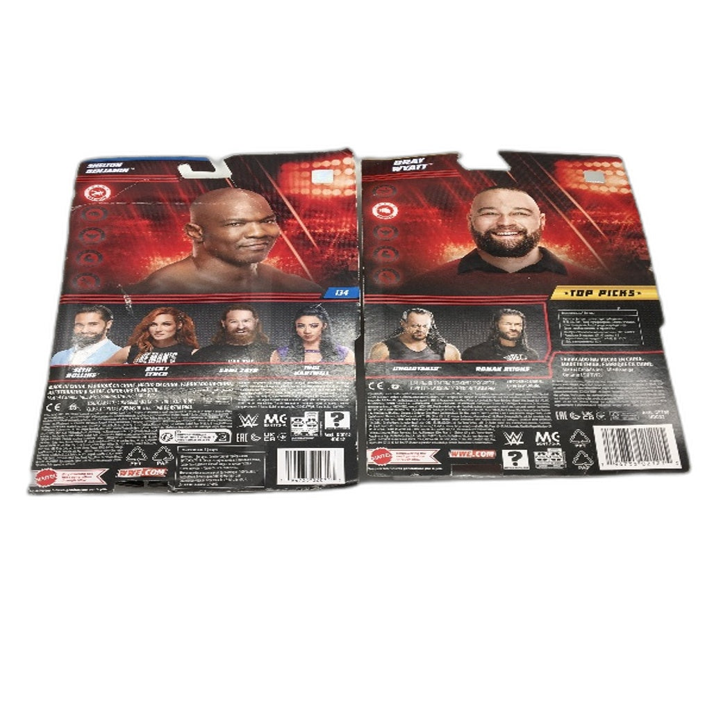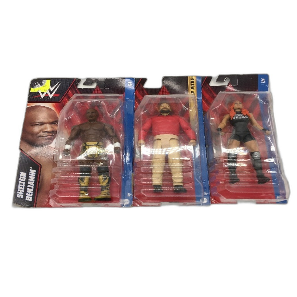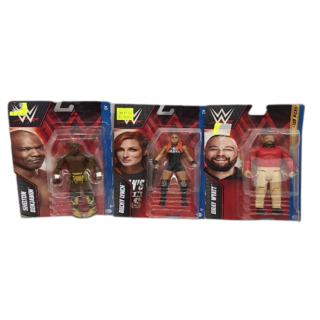 Brand New in Packaging but outer packaging may have minor damage on corners & sticker residue from original retailer Includes: Becky Lynch, Bray Wyatt, Shelton Benjamin