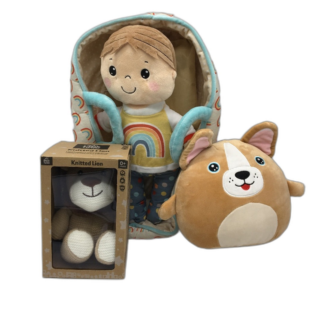 - 3pk My First Carry Doll and Dog Squishee and Knitted Lion Plush Toy Bundle NEW