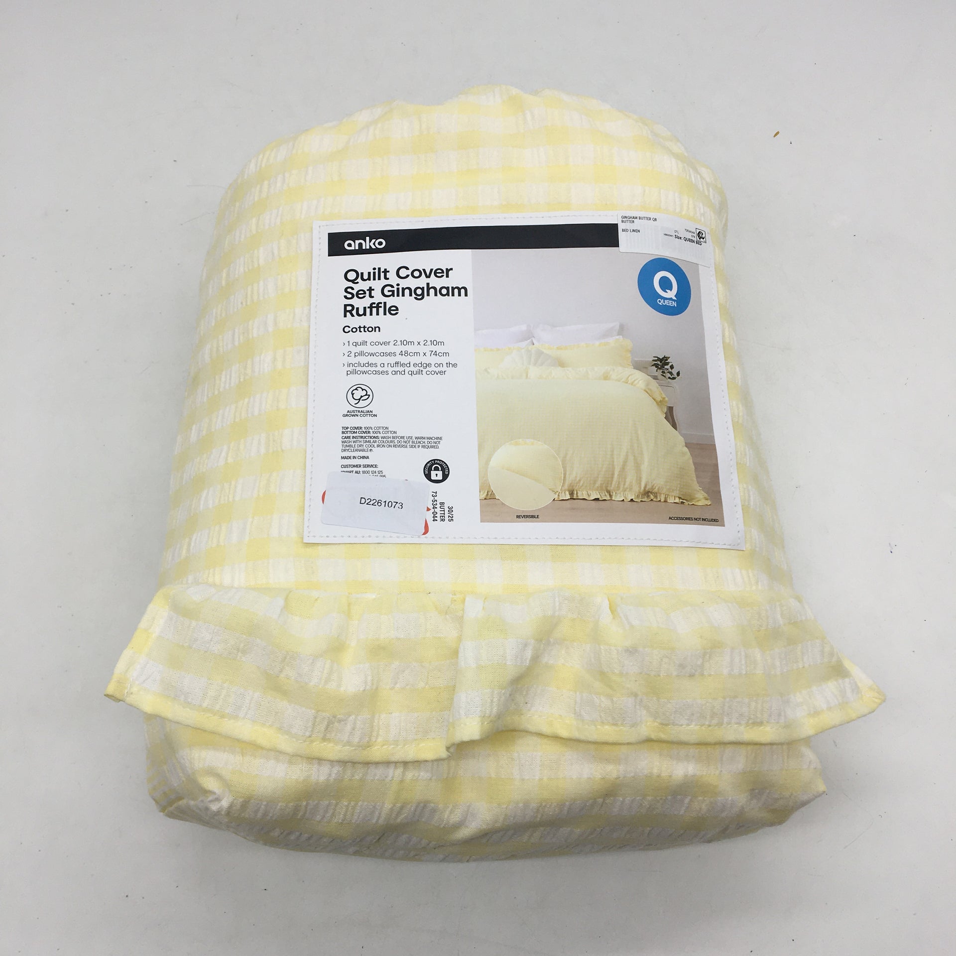 Brand New in Storage Bag Barcode has marker through it Includes 1 x quilt cover and 2 x pillowcases Material: 100% Cotton Dimensions/Size: Quilt cover: 210cm (L) x 210cm (W) Pillowcases: 74cm (L) x 48cm (W