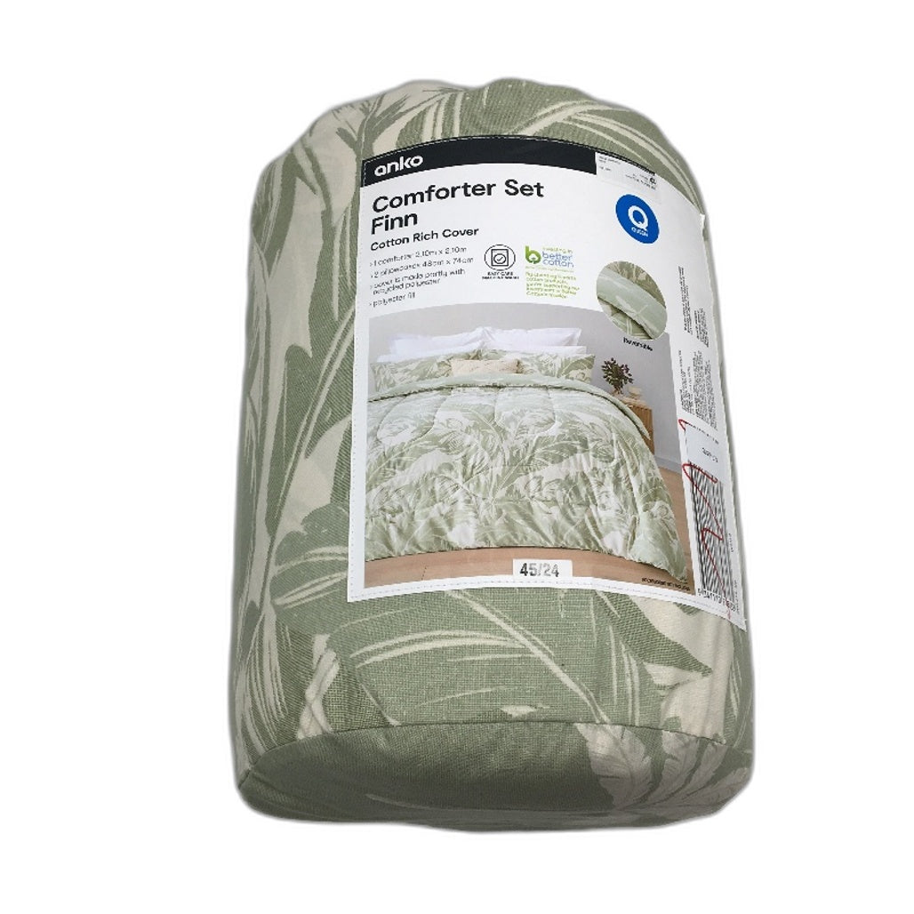Brand New in Storage Bag Barcode has marker through it Transform your bedroom with the Finn Cotton Rich Reversible Comforter Set, featuring a palm print that adds a refreshing touch to your room. Includes 1 x comforter and 2 x pillowcases Material: Comforter: Cover: Cotton and recycled polyester Filling: Polyester Pillowcases: Cotton and polyester Dimensions/Size: Comforter: 210cm (L) x 210cm (W) Pillowcases: 74cm (L) x 48cm (W)