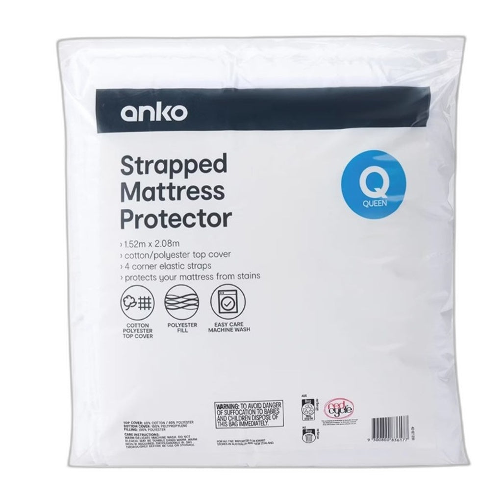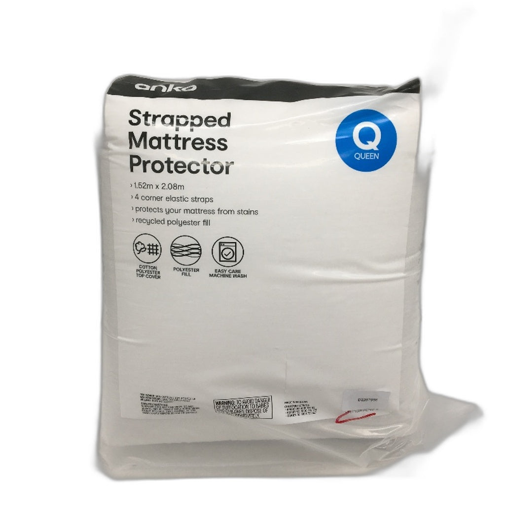 Brand New Barcode has marker through it This Strapped Mattress Protector is ideal for protecting your mattress all year round. The easy to fit elastic straps ensure a snug fit on your bed. Product Details Material: Cotton and polyester Dimensions/Size: 208cm (L) x 152cm (W) Features: 4 corner elastic straps