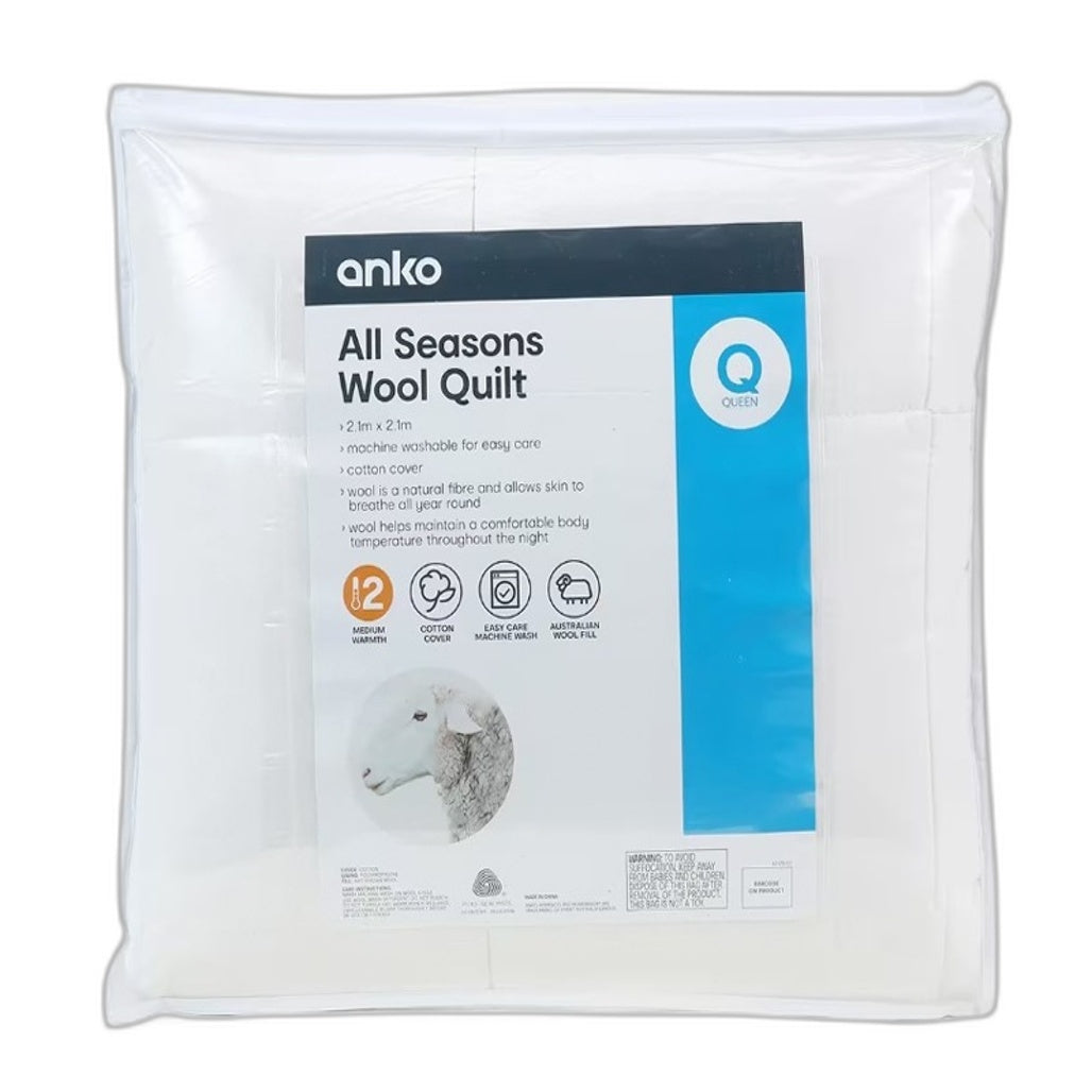 Brand New Barcode has marker through it Stay cosy all year long by adding this Medium Warmth All Seasons Quilt to your bedding products - perfect pick for a great night's sleep. Product Details Material: Cover: Cotton Lining: Polypropylene (PP) Filling: Australian wool Dimensions/Size: 210cm (L) x 210cm (W) Warmth rating: 2 (medium warmth) Product weight: 2.51kg Queen bed Colour: White Features Includes loops in each corner Fasten loops to the ties on your quilt cover to help prevent your quilt from shifting Australian wool is a natural fibre that allows skin to breathe all year round Maintains a comfortable body temperature throughout the night