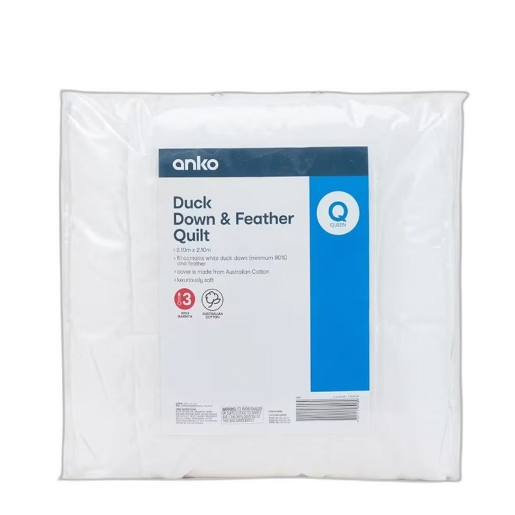 Brand New Barcode has marker through it Duck Down and Feather Quilt - Queen Bed, White Features Fill contains white duck down (minimum 80%) and feather for a soft, plush feel Provides high warmth, perfect for colder nights Soft Australian cotton cover Luxuriously soft and breathable Duck Down and Feather Quilt - Queen Bed, White Specifications Product dimensions: 210cm (L) x 210cm (W) Material: Australian cotton (Cover) Material: Down (minimum 80%) and feather (Fill) Warmth rating: 3 (high warmth) Product weight: 1.64kg Queen bed Made in China Colour: White Care Instructions Fluff up and air frequently Warm delicate machine wash Do not bleach Dry without delay shaking frequently May be tumble dried warm Do not iron Drycleanable Dry thoroughly before re-use or storage