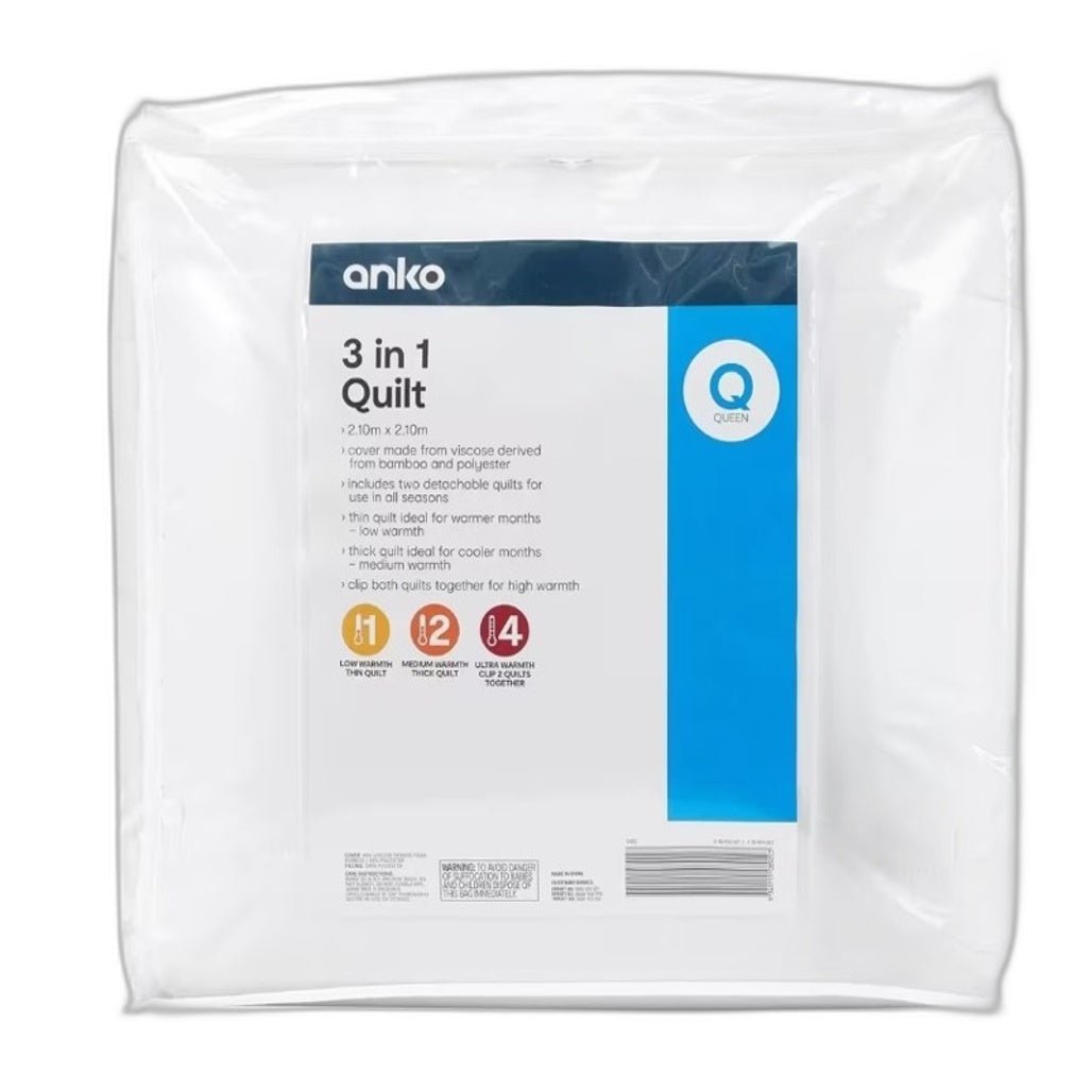 Brand New Barcode has marker through it This versatile 3-in-1 Quilt offers various warmth levels within one product. Its easy to use clip system combines two quilts that can be used individually or together. Use the thin quilt in Summer or warmer climates and the thick quilt in Winter or cooler climates. For the coldest weather, clip both quilts together for an extra thick, insulated layer that provides comfort and heat retention. 3-in-1 Quilt - Queen Bed, White Features Its cover made from viscose derived from bamboo and polyester It includes two detachable quilts, perfect for year-round use, offering flexibility for different seasons It has thin quilt for warmer months and thick quilt for cooler months. Clip both quilts together for high warmth 3-in-1 Quilt - Queen Bed, White Specifications Includes 2 x detachable quilts for use in all seasons Dimensions/Size: 210cm (L) x 210cm (W) Material: Viscose derived from bamboo and polyester (cover) and polyester (filling) Warmth rating: 1 (low warmth, thin quilt) Warmth rating: 2 (medium warmth, thick quilt) Warmth rating: 4 (ultra warmth, clip 2 quilts together) Product weight: 3.8kg