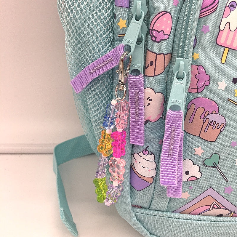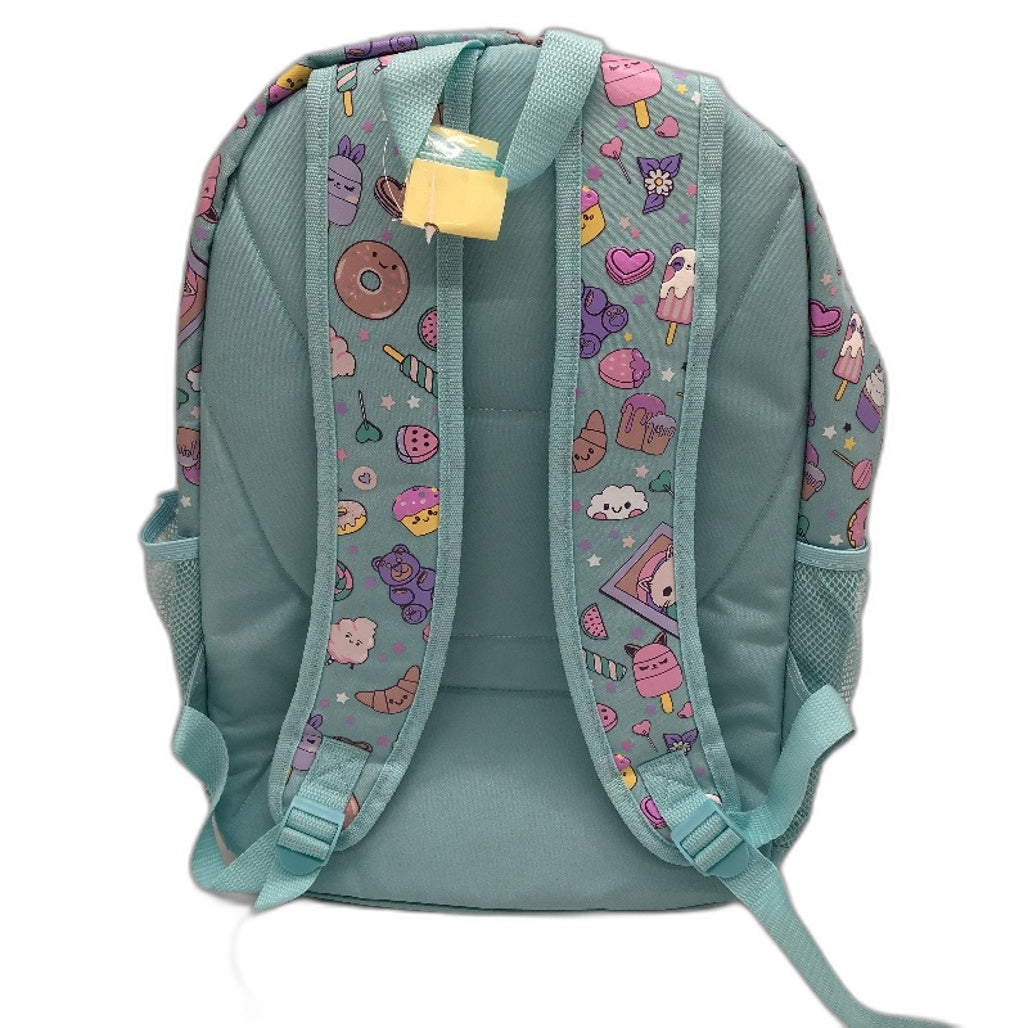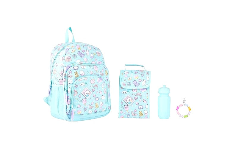 Brand New without tags Includes 1 x backpack, 1 x insulated lunch bag, 1 x water bottle and 1 x bag charm 4 pieces Water bottle: 550ml Dimensions/Size: Backpack: 45cm (H) x 31cm (W) x 16.5cm (D) Lunch bag: 26cm (H) x 18cm (W) x 11.5cm (D) Features Foodie print Backpack: Padded shoulder straps and padded back 1 main compartment 1 medium zippered pocket 1 small zippered pocket Styrene butadiene styrene (SBS) zippers with pullers 2 side mesh pockets Top carry loop Lunch bag: Insulated Flap closure Top carry handle Water bottle: BPA free Bag charm: Teddy bear detail Lobster clasp closure