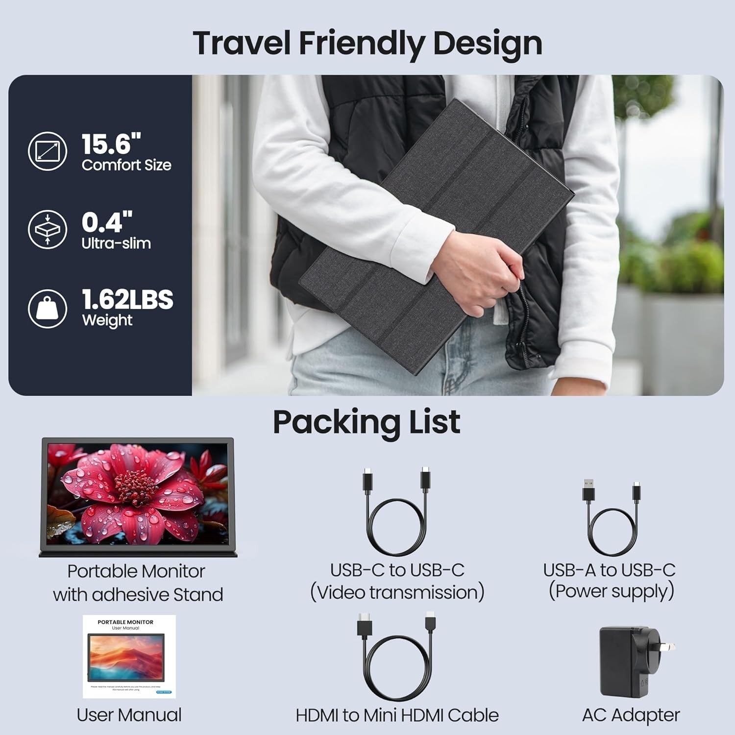 Introducing the FANGOR Portable Monitor for Laptop, a 15.6-inch 1080P FHD Computer Screen Extender designed for seamless connectivity and enhanced productivity. Perfect for gamers and professionals alike, this monitor features USB-C, HDMI, and HDR plug-and-play capabilities, making it the ultimate travel companion for your PC, MAC, PS5, Xbox, and more.