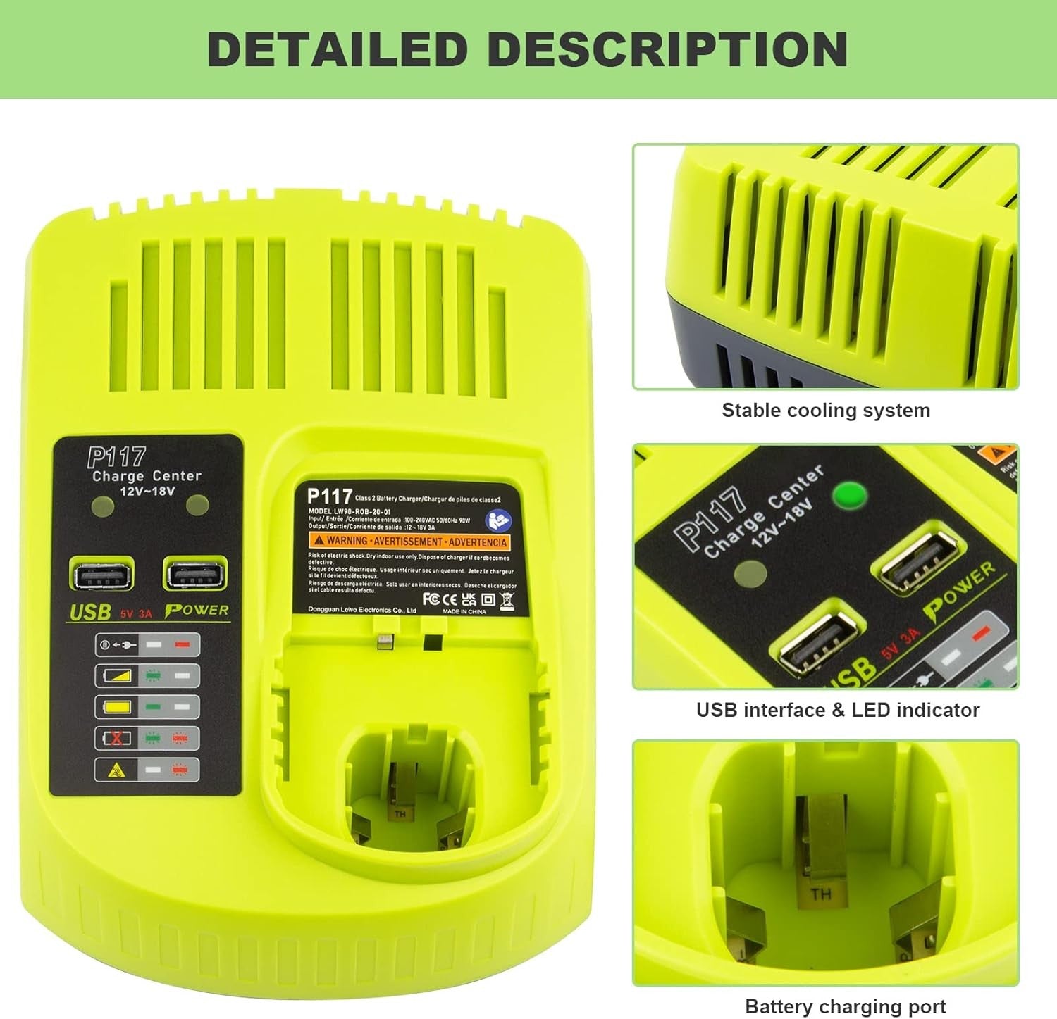 Introducing the ARyee P117 Battery Charger, designed for Ryobi 12-18V One+ NiCd, NiMh, and Li-ion batteries. This versatile charger is compatible with various models, ensuring you stay powered up and ready to go. With its advanced safety features and LED indicators, charging has never been easier!