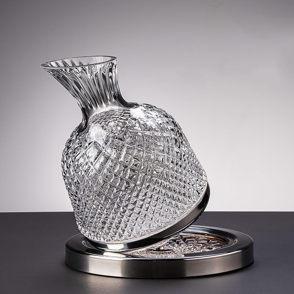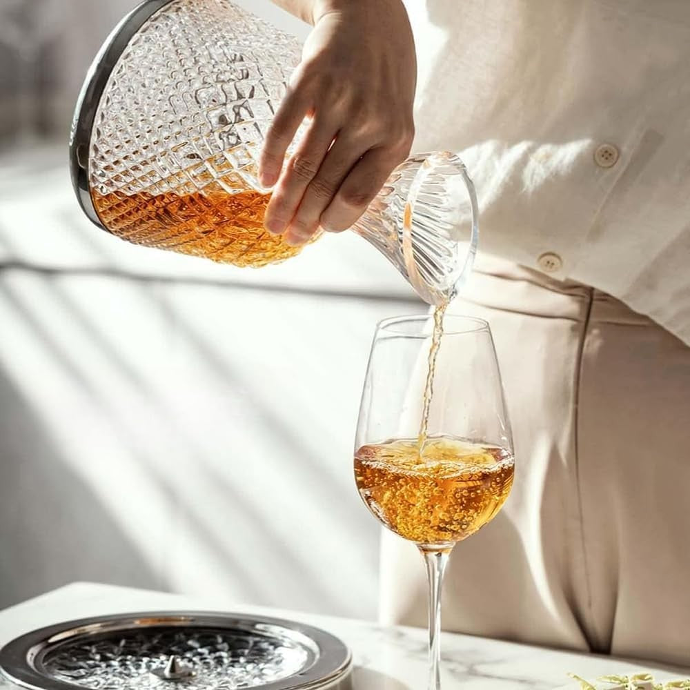 The 360° spinning tumbler crystal wine decanter set makes your wine tasting process more unique and elegant. Perfect for wine lovers, this stunning decanter not only enhances the aroma and taste of your favourite wines but also serves as an exquisite centrepiece for any occasion. Whether it's a business reception, family gathering, or a thoughtful gift for Father's Day, this decanter set is an ideal choice.
