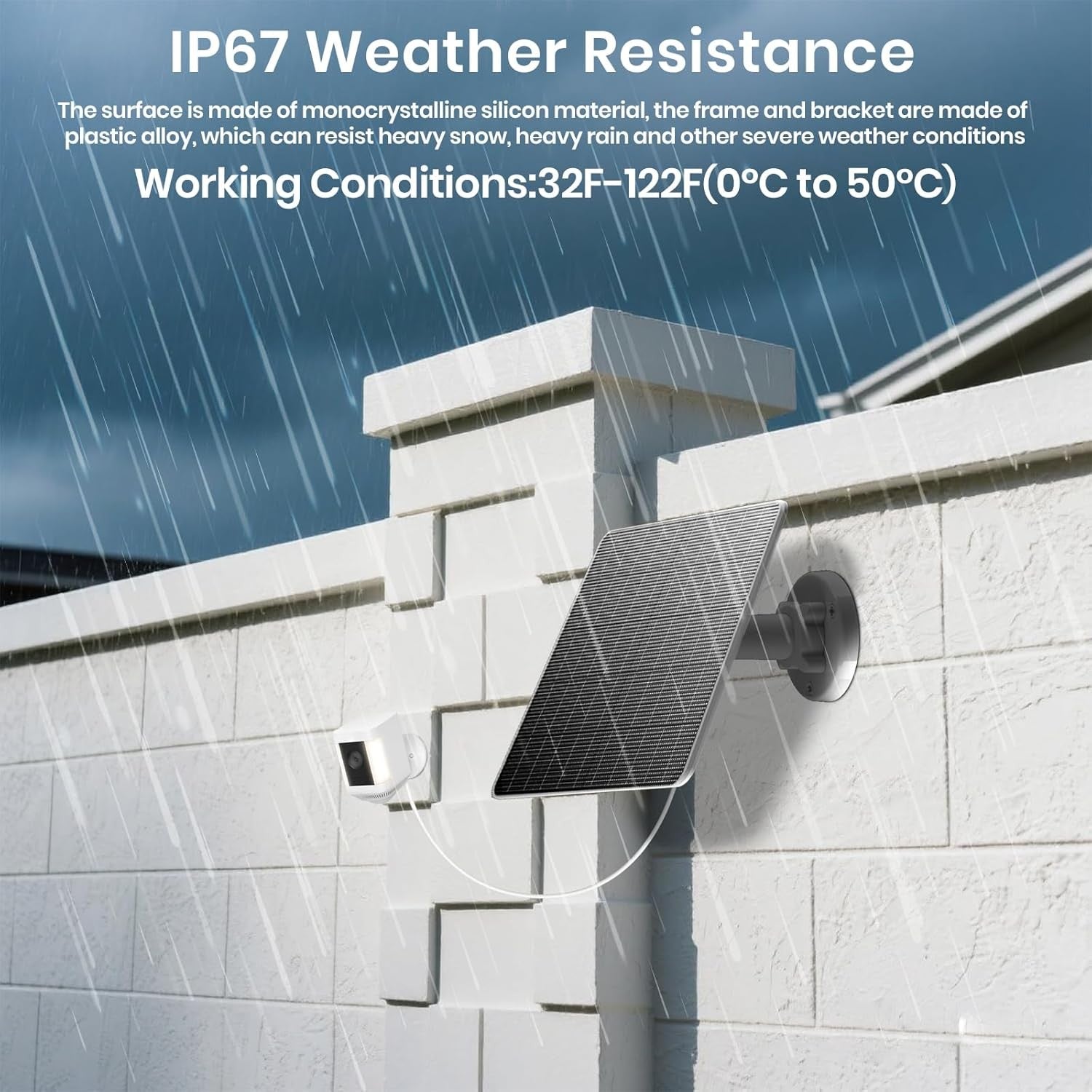 • IP67 Solar panel: The monitoring camera often needs to work in a variety of complex and harsh outdoor environments. The FlexSolar solar panel uses IP67 monocrystalline silicon, which has excellent waterproof, dust-proof, windproof and corrosion resistance, and can withstand the test of rainstorm, sand dust, wind and other severe weather.