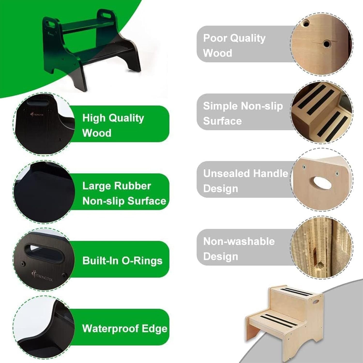 Introducing the StrongTek Wood 2 Step Stool for Kids, designed to provide essential support for reaching high areas in a safe and convenient manner. This portable stool features a non-slip stepping surface, making it perfect for kids in the kitchen, bathroom, or bedroom. With a sturdy capacity of 300 lbs, it's a reliable choice for both children and adults.