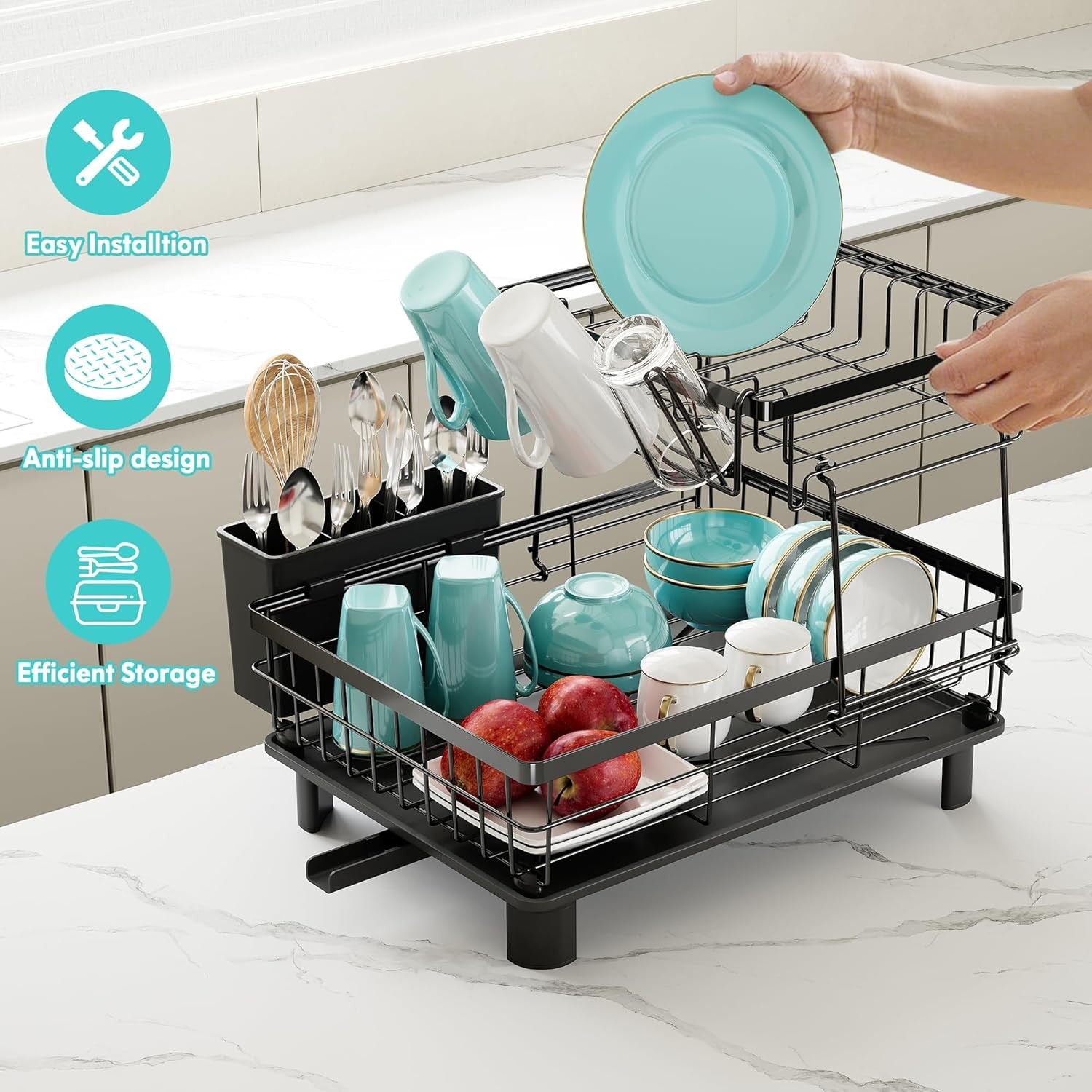 Introducing the Boosiny 2 Tier Dish Drying Rack, a space-saving solution for your kitchen countertop. This stainless steel dish rack features an innovative automatic drainage system that keeps your counter dry while providing ample space for drying dishes. Ideal for singles or couples, this compact dish drainer is a must-have for any kitchen.