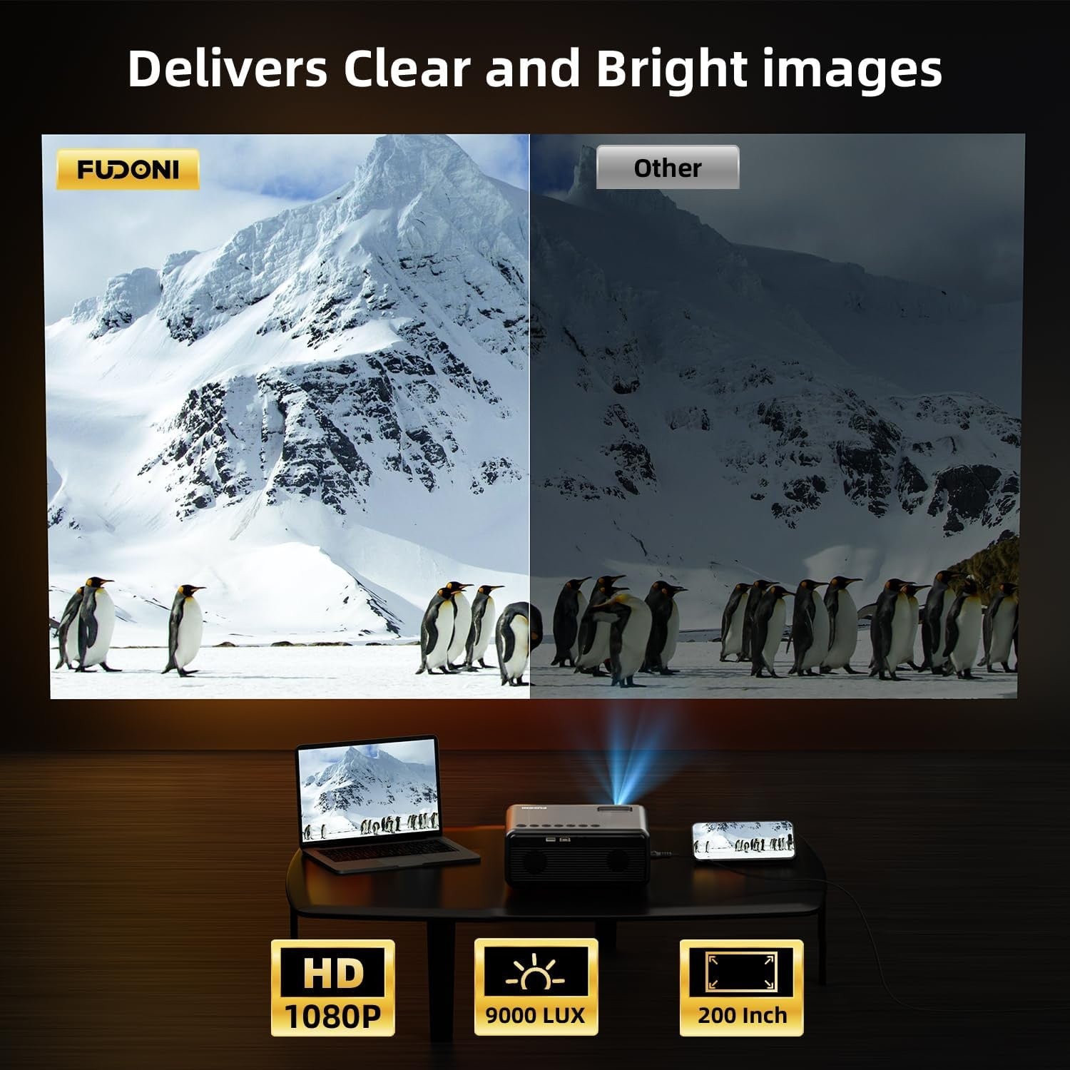 Experience stunning visuals with the FUDONI Mini Projector, a portable projector that supports 4K and 1080P resolutions. With its impressive 12000 lumens brightness, this projector is perfect for both outdoor movie nights and indoor presentations. Compatible with a variety of devices, it’s the ideal choice for your entertainment needs.