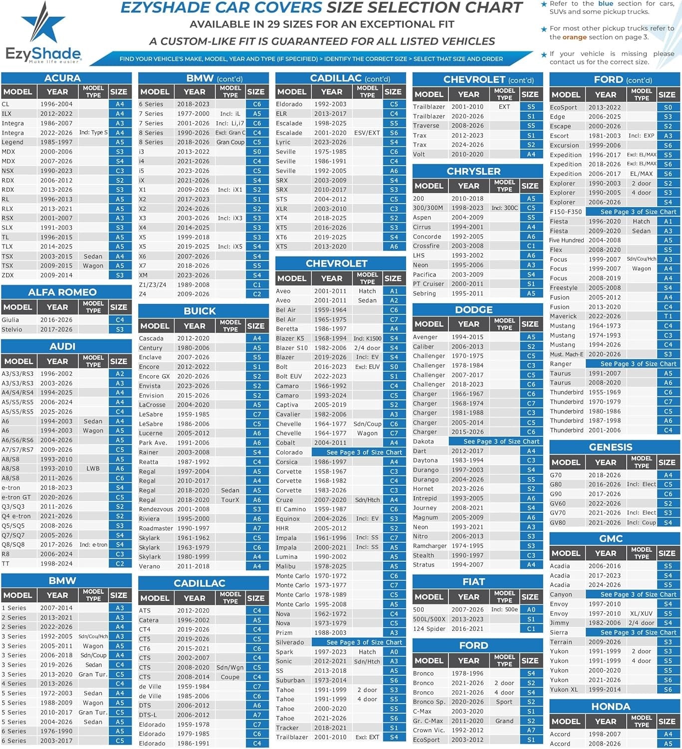 Protect your vehicle with the EzyShade 10-Layer Car Cover, designed for all weather conditions. This durable cover is perfect for SUVs and sedans, providing exceptional waterproofing and sun protection. Check the vehicle size chart to ensure the perfect fit for your car.