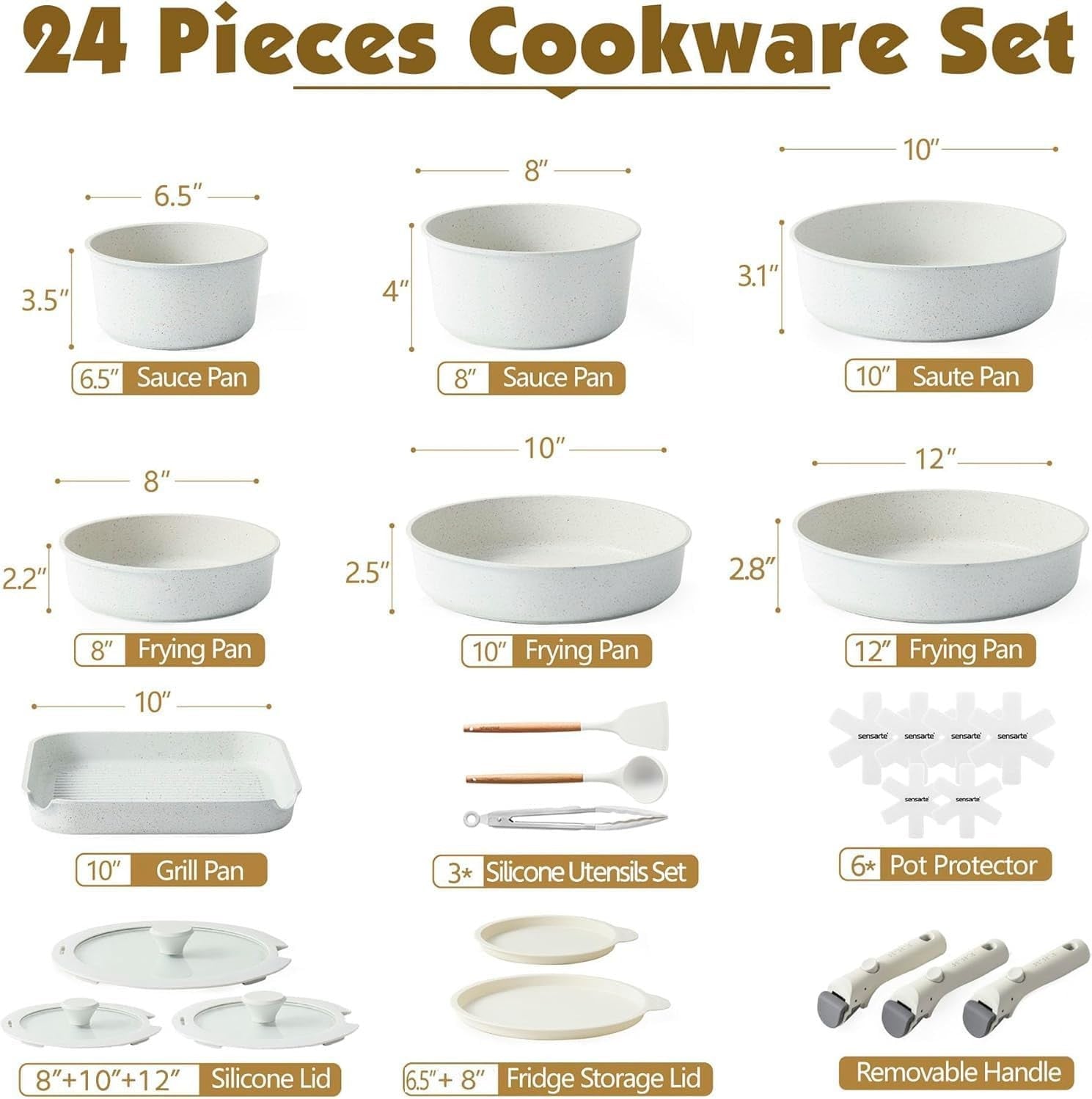 Discover the SENSARTE 24 Piece Pots and Pans Set, designed for modern kitchens. This nonstick detachable handle cookware set is perfect for healthy cooking, featuring a PFOA-free granite non-stick surface. Ideal for RV cooking, this versatile kitchenware is dishwasher and oven safe.