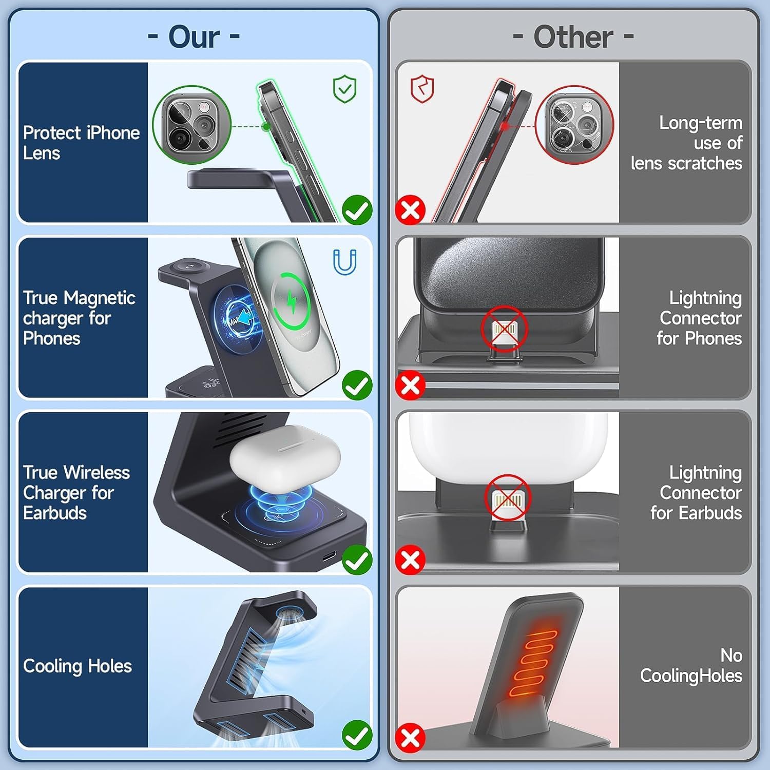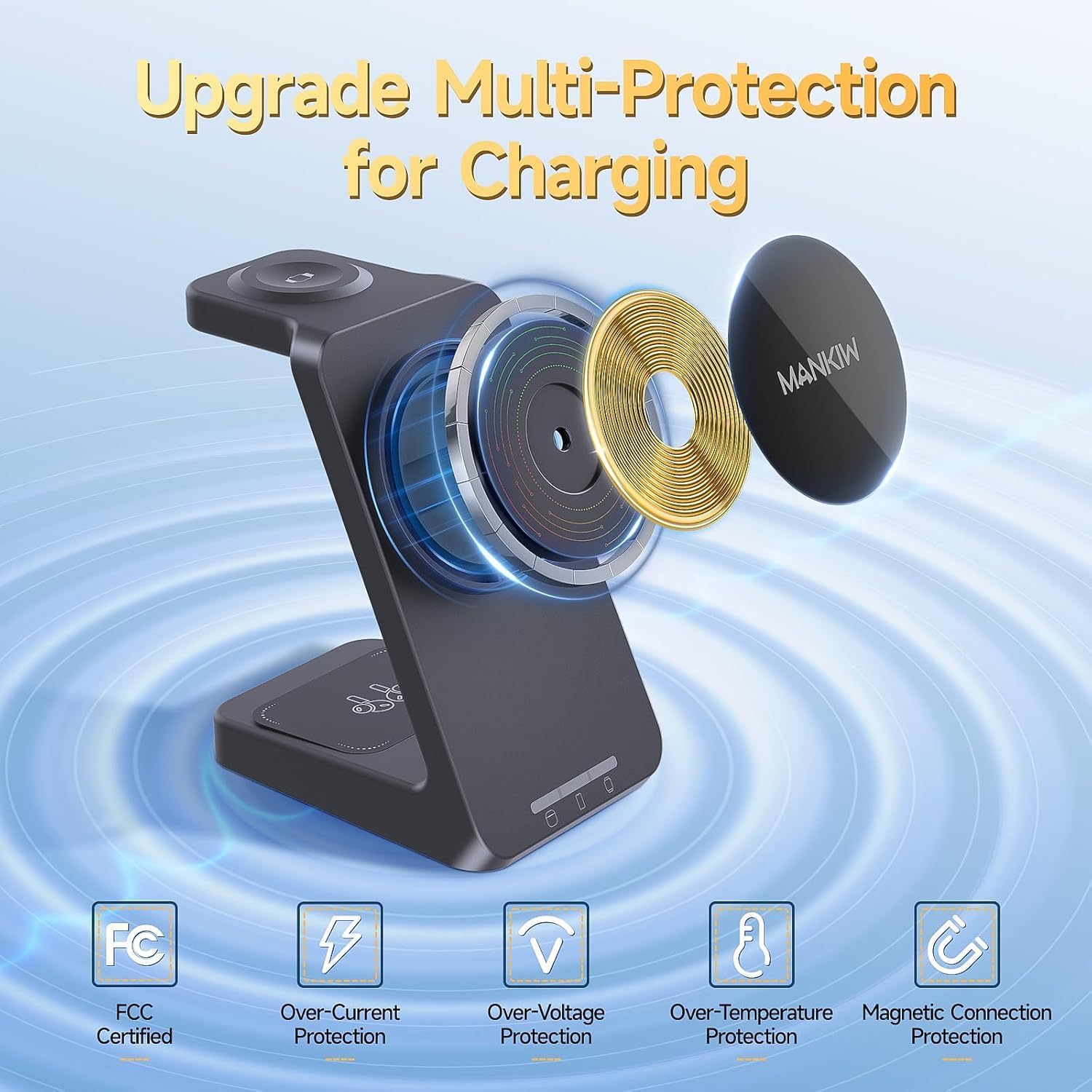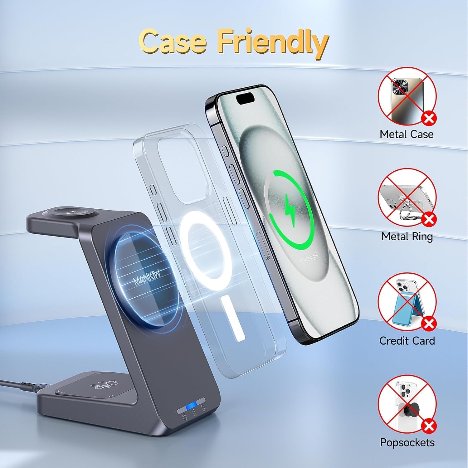 Elevate your charging experience with the MANKIW W99 3-in-1 Induction Chargers. This versatile charging station seamlessly powers your iPhone, Apple Watch, and AirPods, keeping your workspace clutter-free and your devices charged efficiently.